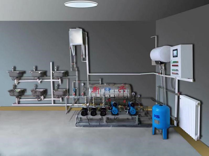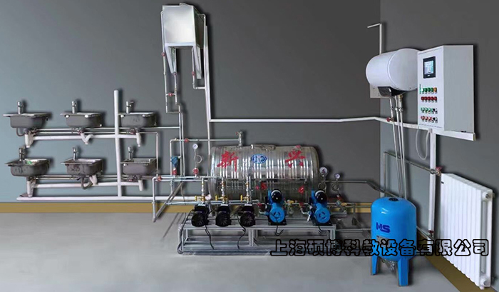 1、生活給水系統(tǒng):主要有給水箱、給水泵、給水管道、壓力變送器、脈沖水表、水龍頭和淋浴頭等組成。管路采用不銹鋼管進行設(shè)計,可進行不銹鋼管的切割、安裝和通水試驗操作,通過控制系統(tǒng)可實現(xiàn)生活給水系統(tǒng)的變頻恒壓供水功能,實現(xiàn)單泵變頻控制或雙泵切換控制等功能;通過脈沖式水表可以完成用水量的計量。