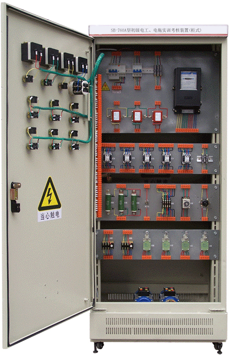 初級(jí)電工電拖實(shí)訓(xùn)考核裝置,初級(jí)電工考核柜,初級(jí)電工實(shí)訓(xùn)考核裝置是按照勞動(dòng)社會(huì)保障部頒發(fā)的“工人技術(shù)等級(jí)標(biāo)準(zhǔn)”和“職業(yè)技能鑒定規(guī)范”的內(nèi)容要求,根據(jù)初級(jí)電工培訓(xùn)考核的實(shí)際情況而設(shè)計(jì)的新一代集培訓(xùn)學(xué)習(xí)、理論驗(yàn)證、實(shí)際操作能力、考核鑒定于一體的多功能柜式設(shè)備。整臺(tái)設(shè)備以標(biāo)準(zhǔn)的電氣控制柜為主柜,利用柜體的雙面空間,布置電器 及配套實(shí)驗(yàn)器材,能完成初級(jí)電工考核鑒定中的電力拖動(dòng)控制與照明電路的實(shí)操項(xiàng)目,該電工、電拖實(shí)訓(xùn)考核裝置堅(jiān)持理論聯(lián)系實(shí)際的原則,突出技能訓(xùn)練,注重針對(duì)性、實(shí)用性、科學(xué)性,經(jīng)全國多家職業(yè)技能訓(xùn)練中心、職校、技校使用證明,該柜體設(shè)計(jì)合理、實(shí)操方便,占地面積少。為延長電器的使用壽命,各電器的接點(diǎn)都與接線端子相連,再讓學(xué)生在接線端子上接線,連接電機(jī)、電器來完成各項(xiàng)控制實(shí)驗(yàn),有效降低材料消耗,延長使用壽命。該套設(shè)備適用于各勞動(dòng)職業(yè)技能鑒定部門,同時(shí)適應(yīng)各大、中專、技校、職校初級(jí)電工、電拖專業(yè)教學(xué)與實(shí)訓(xùn)考核。