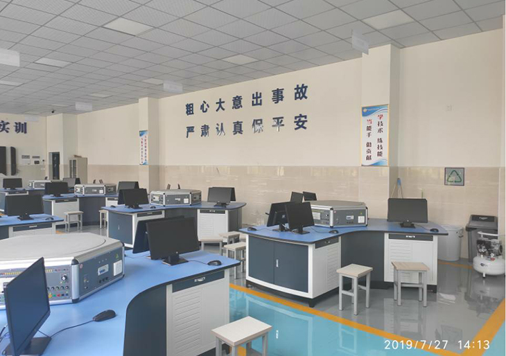 技能工作島由三邊弧形工作臺、六邊形實訓控制屏及典型工作任務組成,能同時容納6名學生在設備上進行操作。