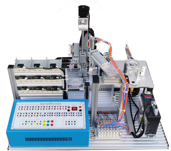模型底板由10mm厚鋁板加工氧化而成,模型由堆垛機、立體倉庫、搬運機械手、稱重加料機構、傳感器、氣缸等組成;所有機構由有1.2mm優(yōu)質鋼板加工噴涂制作或鋁材機加氧化而成,堅固耐用。該任務堆垛機有步進與伺服控制,負責物料的出入倉;機械手負責對物料的加料前后的搬運;稱重加料機構對物料進行稱重及加料工作。同時為方便教學,開發(fā)了全開放的任務接口盒,盒體由1.2mm優(yōu)質鋼板加工噴涂制作,面板有鋁板噴涂蝕印沖孔而成,通過并口電纜與智能存儲任務模型連接,以迭插端子形式開放模型接口,方便實訓教學。