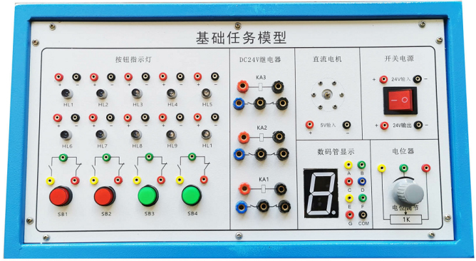 該任務盒有1.2mm優(yōu)質鋼板加工噴涂制作,面板有鋁板加工沖孔而成,表面貼膜制作,配置有直流電機、7段數(shù)碼管、彩燈組、繼電器組、按鈕組、電位器等,能滿足對PLC教學基礎任務指令的學習與應用。