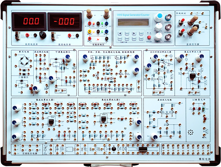 模擬電路實驗箱由鋁木合金箱體、高性能線性電源、和實驗電路板組成。其中實驗電路采用固定功能模塊方式,電路原理和元器件符號清晰,實驗用元器件可以焊裝在線路板的反面,安全可靠,不易損壞,也可以裝在線路板的正面,元件直觀可見,感性認識強,正面還有實驗電路原理圖,使學(xué)生在實驗時對原理一目了然。