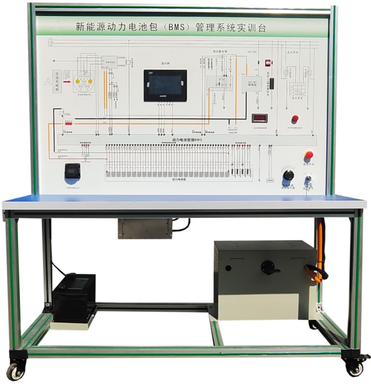 磷酸鐵鋰動(dòng)力電池包與鐵制電池箱(單體電池3.2V 20AH,24串)、BMS鋰電管理一體機(jī)、動(dòng)力電池包觸摸顯示屏、車(chē)載充電機(jī)、國(guó)標(biāo)充電插口、國(guó)標(biāo)充電槍、緊急斷電開(kāi)關(guān)、霍爾電流傳感器、直流接觸器(包含充電繼電器、總正繼電器、總負(fù)繼電器、預(yù)充繼電器)、DC-DC轉(zhuǎn)換器(72V-12V30A)、輔助蓄電池(12V45AH)、放電控制繼電器與放電負(fù)載電阻、預(yù)充電阻器、可移動(dòng)實(shí)訓(xùn)臺(tái)(1500×700×1700mm 帶自鎖腳輪裝置,帶安裝檢測(cè)端子的原理面板,面板1448×940mm)、故障模擬與排除裝置、設(shè)備操作說(shuō)明書(shū)。