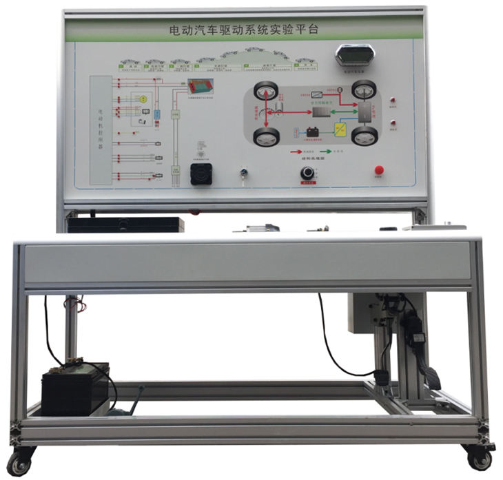 檢測控制面板(裝有各種檢測端子,1448×940mm彩色電路圖和工作原理示意圖)、組合儀表、點火開關(guān)、電機控制器、車載充電器與充電接口、DC-DC轉(zhuǎn)換器、鋰動力電池組、電動車電機(直流無刷電機)與變速箱、后輪左右液壓制動裝置、驅(qū)動橋傳動裝置、剎車開關(guān)、檔位開關(guān)、油門控制裝置、大電流繼電器、電源總開關(guān)、急停開關(guān)、輔助蓄電池(12V45AH)、一體化全鋁合金型材搭建的移動臺架(1500×700×1700mm (帶自鎖腳輪裝置,帶安裝檢測端子的原理面板,面板1448×940mm)、故障考核系統(tǒng)、設備操作說明書。