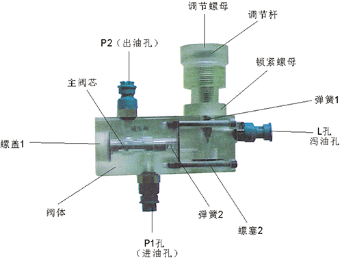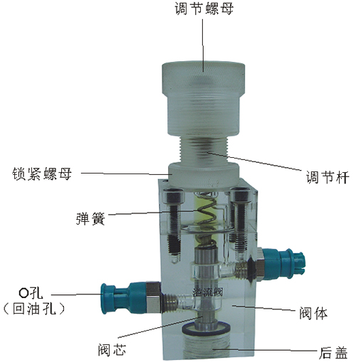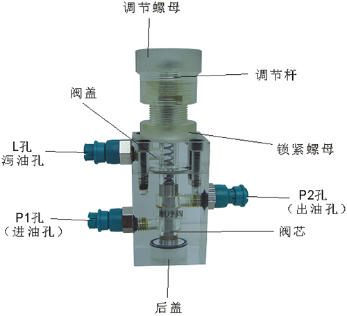 2、溢流閥結(jié)構(gòu)上參考了國產(chǎn)P-63B型低壓直動式溢流閥,其閥體閥蓋、鎖緊螺母、調(diào)節(jié)螺母、螺塞等采用了進(jìn)口透明有機(jī)玻璃材料精制而成,閥芯、調(diào)節(jié)桿采用了45#中碳鋼材料。并配合彈簧,油接頭,密封圈等標(biāo)準(zhǔn)件裝配而成,通過它可明確地觀察到閥芯、彈簧、油孔等結(jié)構(gòu)及其運(yùn)行過程,具有形象逼真,性能可靠等優(yōu)點(diǎn)。它即可作為教學(xué)模型,也可以作為液壓實驗元件進(jìn)行實驗演示。