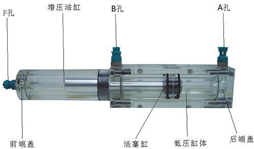 2、增壓油缸的前端、后端蓋、低壓缸體、增壓缸體等均采用了進(jìn)口透明有機(jī)玻璃材料精制而成,透明清晰,活塞桿采用了合金鋁材料,并配合油接頭,密封圈,內(nèi)六角螺絲等標(biāo)準(zhǔn)件裝配而成,通過它可明確地觀察到活塞桿,油封,油孔等結(jié)構(gòu)及其運(yùn)行過程,具有形象逼真,性能可靠等優(yōu)點(diǎn),它既可作為教學(xué)模型,也可以液壓實驗元件進(jìn)行實驗演示。