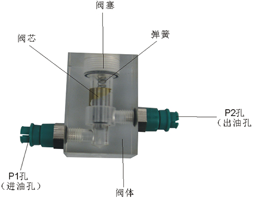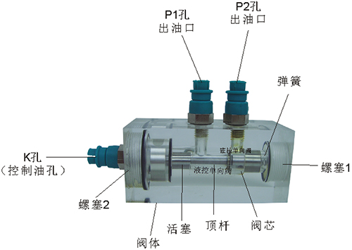 2、液控單向閥結(jié)構(gòu)上參考了國產(chǎn)IY-25B型液壓單向閥,其閥體、螺塞等采用了進(jìn)口透明有機(jī)玻璃材料精制而成,閥芯、頂桿采用了45#中碳鋼材料,并配合彈簧,油接頭,密封圈等標(biāo)準(zhǔn)件裝配而成,通過它可明確地觀察到活塞、彈簧、油孔等結(jié)構(gòu)及其運(yùn)行過程,具有形象逼真,性能可靠等優(yōu)點(diǎn)。它即可作為教學(xué)模型,也可以作為液壓實驗元件進(jìn)行實驗演示。