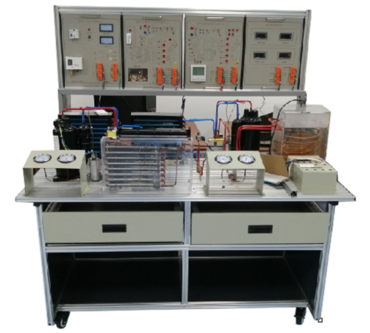 實訓桌采用工業(yè)標準鋁型材件與鈑金結(jié)構(gòu)件拼裝而成,結(jié)構(gòu)堅固,造形美觀大方;設(shè)有二個大抽屜,用于放置實訓導線或工具等。實訓桌臺面用于放置熱泵型家用空調(diào)和空氣源熱泵系統(tǒng)的元器件并提供一個寬敞舒適的工作臺面,學生可以在工作臺面上將制冷系統(tǒng)的器件任意安裝,實訓桌還設(shè)有四個萬向輪,便于移動和固