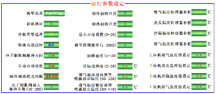 11)、顯示界面上29 路參數(shù)控制參數(shù)設(shè)置/查詢:控制器內(nèi)所有與控制相關(guān)的溫度參數(shù)、時間參數(shù)、控制參數(shù)、等29個參數(shù)都可以調(diào)整,以適應制冷/熱泵/冷庫/水機等設(shè)備。